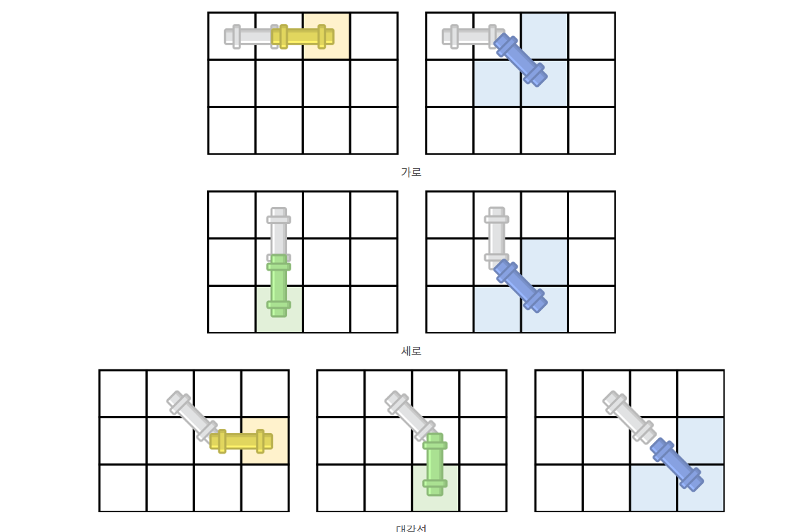 파이프를 옮기려고 할 때 파이프는 45도만 회전시킬 수 있다. 가장 처음 파이프는 (1,1)와 (1,2)를 차지하고 있고 파이프의 한쪽 끝을 (N, N)로 이동시키는 방법의 개수를 구해보자.